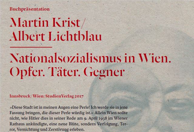 Das als Band 8 in der von Horst Schreiber im Auftrag von _erinnern.at_ herausgegebenen Reihe Nationalsozialis-mus in den österreichischen Bundesländern erscheinende Sachbuch vermittelt einen auf dem neuesten Forschungsstand beruhenden Überblick zum Thema „Wien und Nationalsozialismus“. Es behandelt in Sachtexten sowie exemplarischen Kurzbiografien die Vorgeschichte der NS-Diktatur und die Machtübernahme, die Ursachen für die Begeisterung der Bevölkerung sowie die Angebote des NS-Regimes. Im Fokus stehen aber auch der NS-Terrorapparat, die aus rassistischen bzw. politischen Gründen oder wegen ihrer sexuellen Orientierung Verfolgten, der Widerstand und der Kriegsalltag der Stadt. Zudem werden Kriegsende und Befreiung, Aufarbeitung und Erinnerungskultur thematisiert. Das Buch wendet sich an Geschichtsinteressierte, unterstützt Lehrerinnen und Lehrer in der Unterrichtsgestaltung, ist aber auch in der außerschulischen Jugendarbeit einsetzbar.