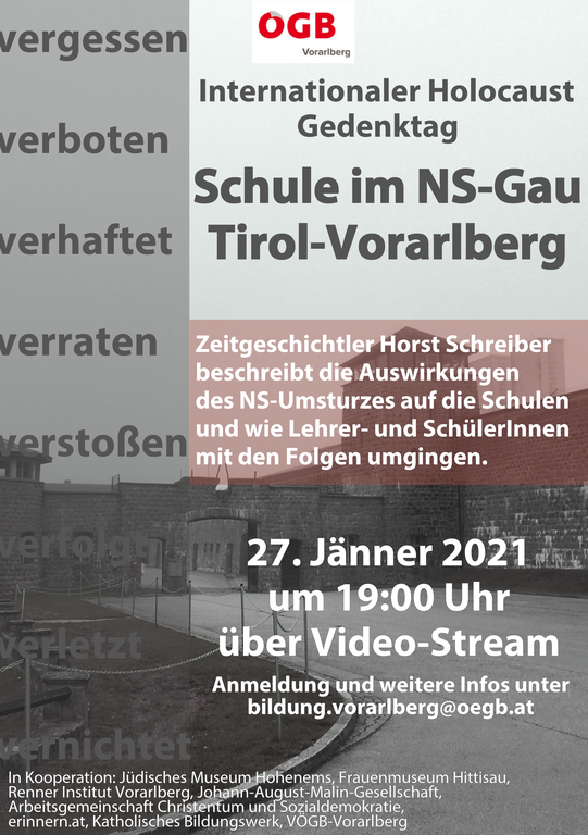 Eine Veranstaltung des VÖGB (Verband Österreichischer Gewerkschaftlicher Bildung) in Kooperation mit: Jüdisches Museum Hohenems, Renner Institut Vorarlberg, Frauenmuseum Hittisau, Arbeitsgemeinschaft Christentum und Sozialdemokratie, Johann-August-Malin-Gesellschaft, _erinnern.at_ und Katholisches Bildungswerk Vorarlberg.