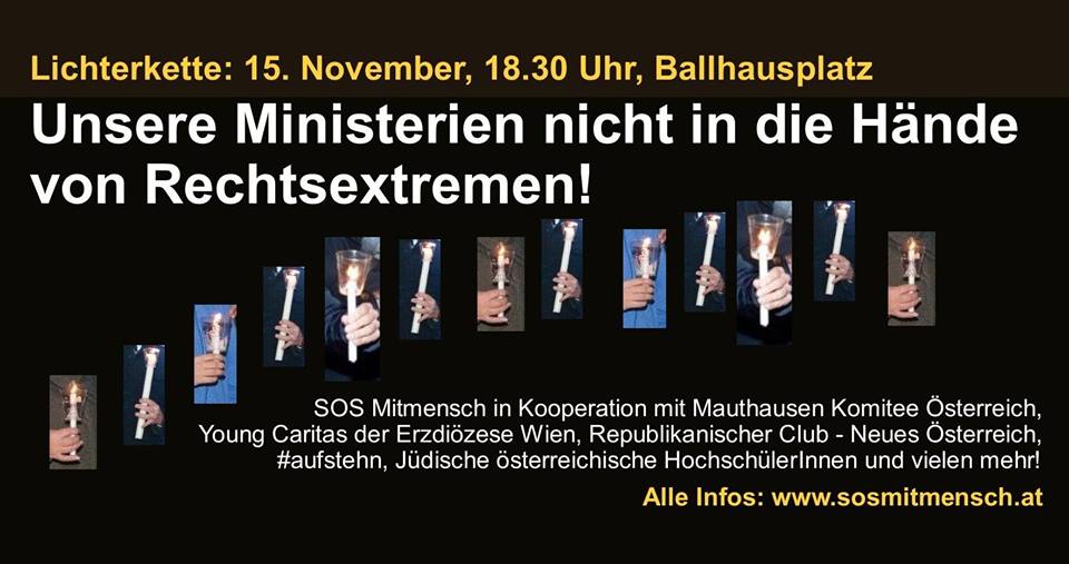 Daher ruft SOS Mitmensch in Kooperation mit dem Mauthausen Komitee Österreich, der Young Caritas der Erzdiözese Wien, dem Republikanischen Club - Neues Österreich, Jüdische Österreichische HochschülerInnen, #aufstehn, der Volkshilfe, der Evangelischen Frauenarbeit und vielen mehr für Mittwoch, den 15. November zur Bildung einer Lichterkette rund um das Regierungsviertel in Wien auf.